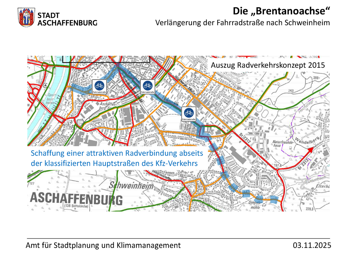 Die sogenannte „Brentanoachse“ ist eine 3,8 Kilometer lange Radhauptverbindung, die parallel zu den Hauptstraßen des Kfz-Verkehrs verläuft. Sie ist die fahrradfreundliche